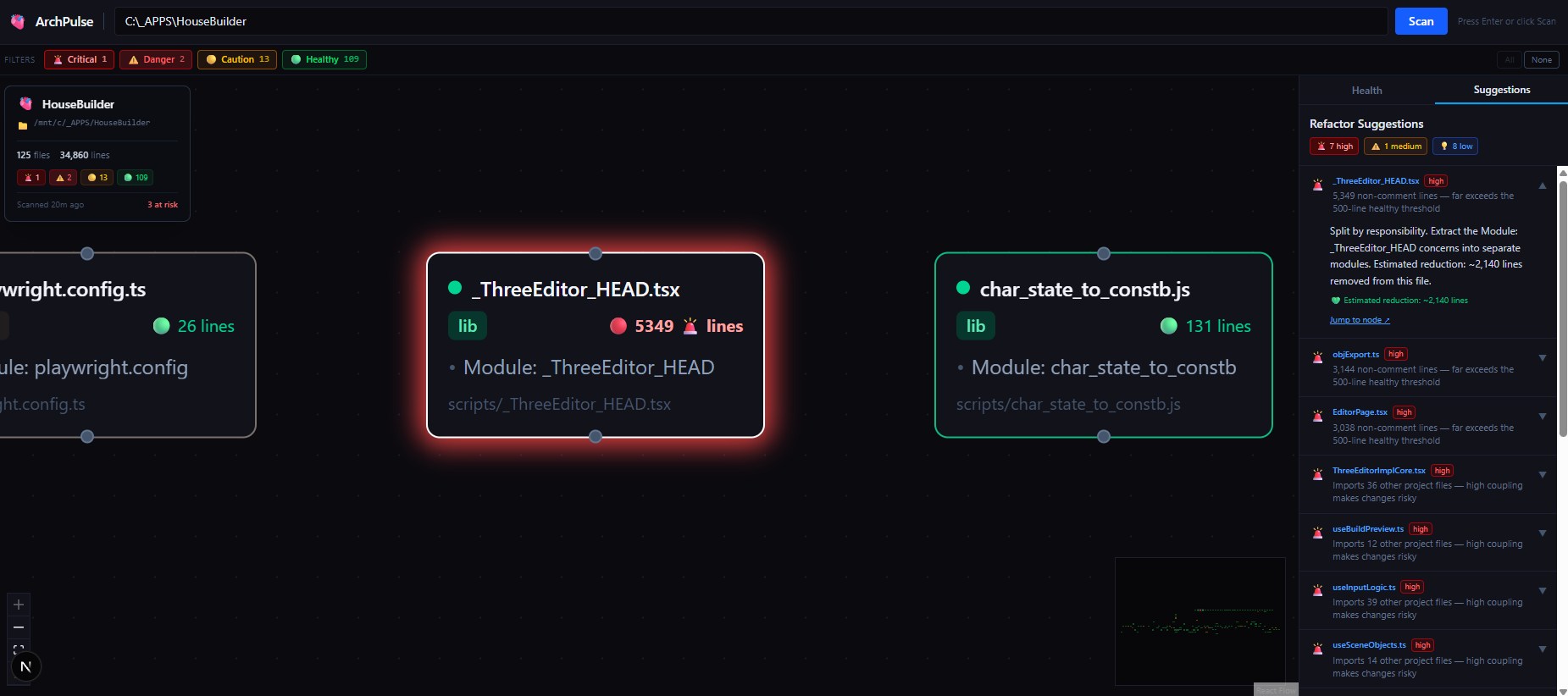 The first time I ran ArchPulse on a large project, I immediately spotted three files with over 5,000 lines of code—true god components that had been hiding in plain sight. With the JSON export, I could hand off a precise refactor plan to an agent, who then broke up the files and reduced coupling across the codebase.
