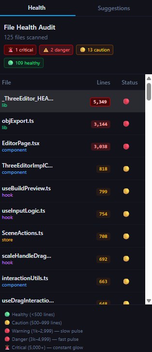 - Animated pulse: files over 1,000 lines pulse red; over 5,000 lines, they glow constantly