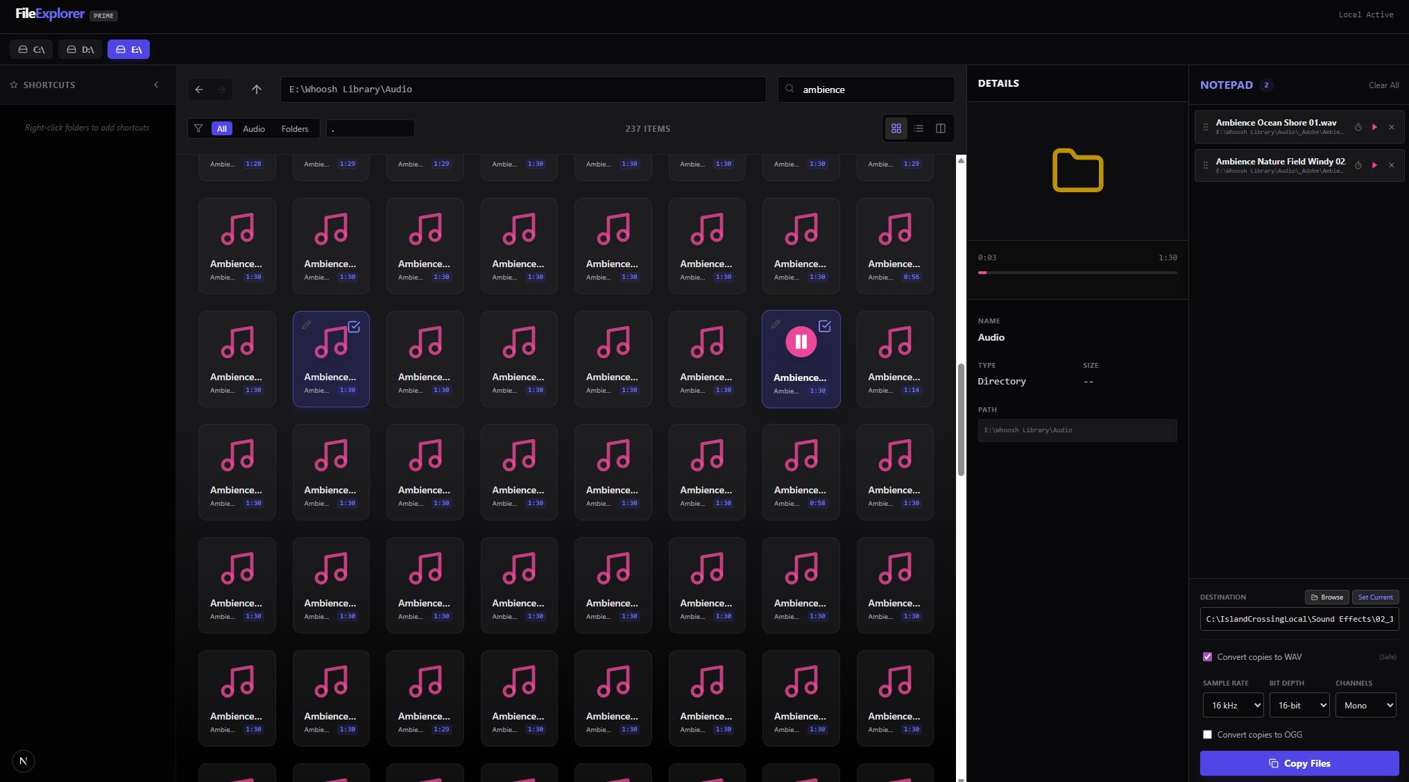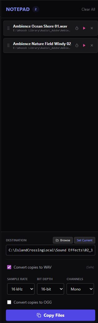 - Queue up files from my external drive, then copy them to another destination and convert them to an optimal WAV format (so I can actually use them in my projects, without extra steps)